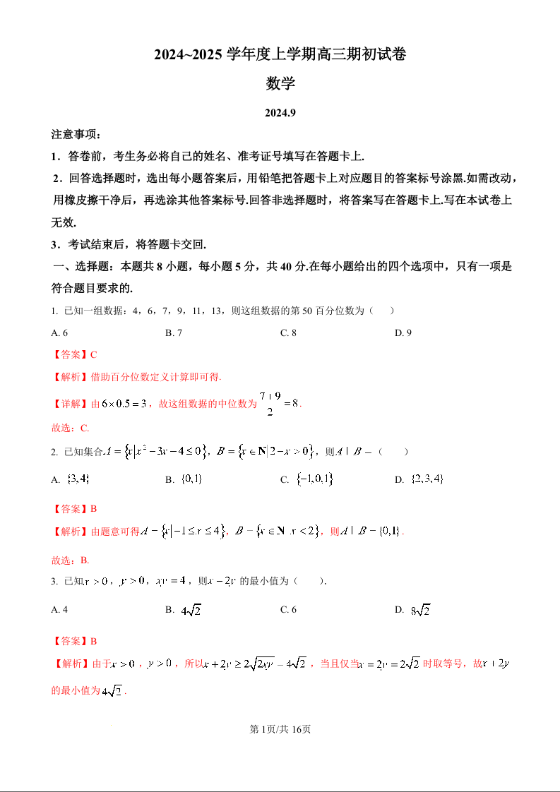 江苏省镇江市2024~2025学年第一学期期初高三质量监测 数学答案