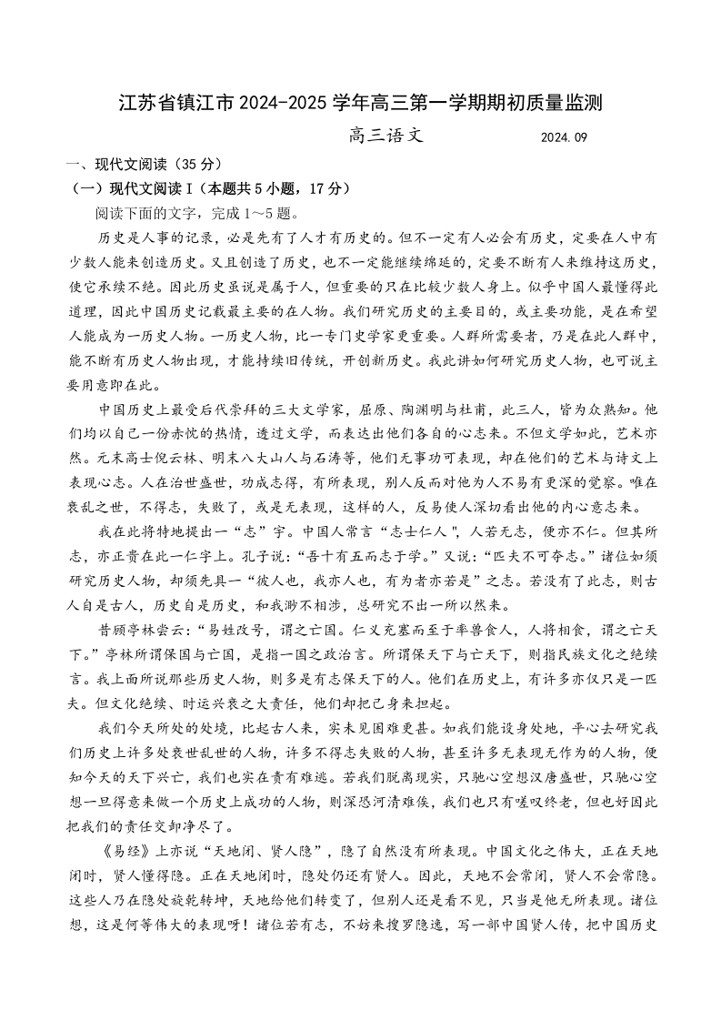 江苏省镇江市2024~2025学年第一学期期初高三质量监测 语文