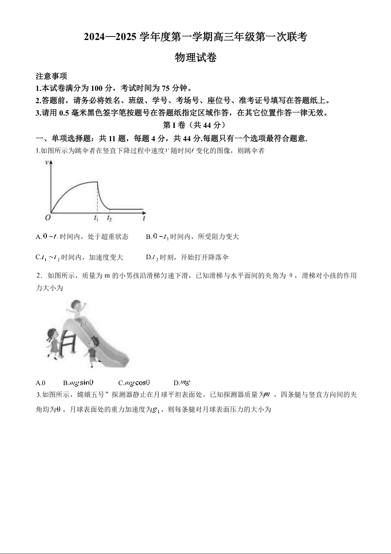 江苏省淮安市十校2024-2025学年高三上学期第一次联考 物理