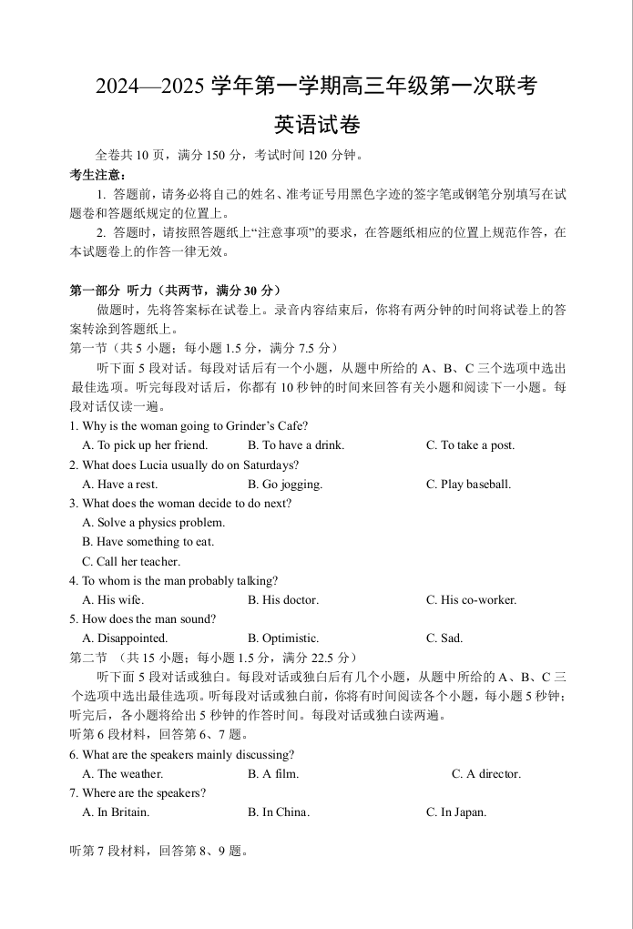江苏省淮安市十校2024-2025学年高三上学期第一次联考 英语
