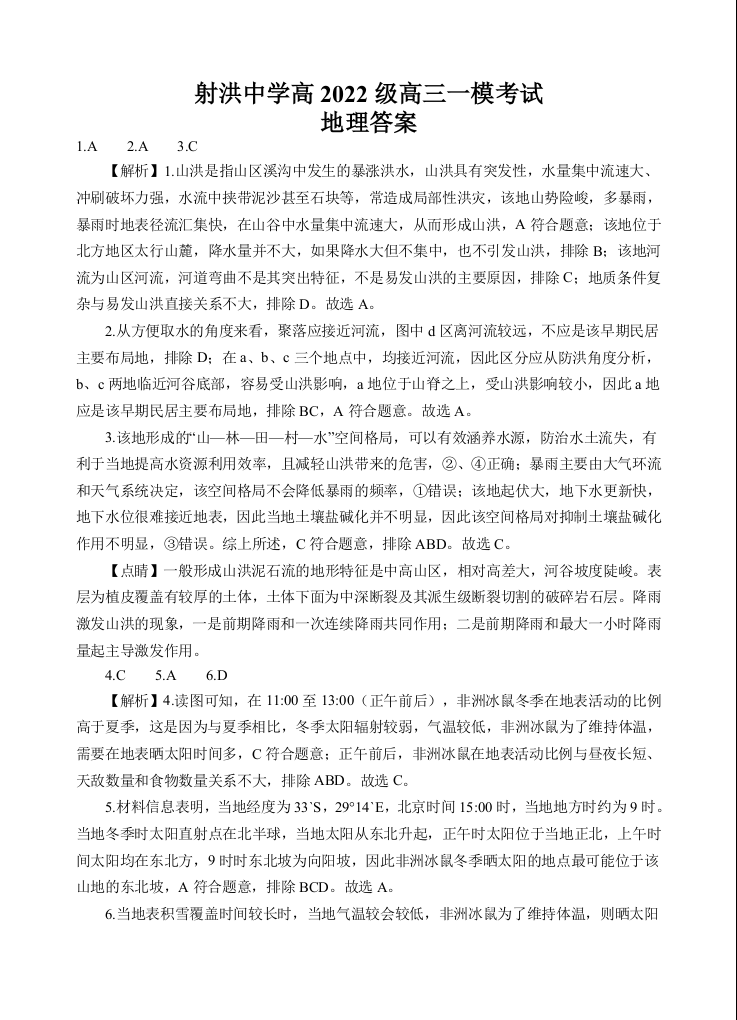 四川省射洪中学高2022级高三一模考试 地理答案