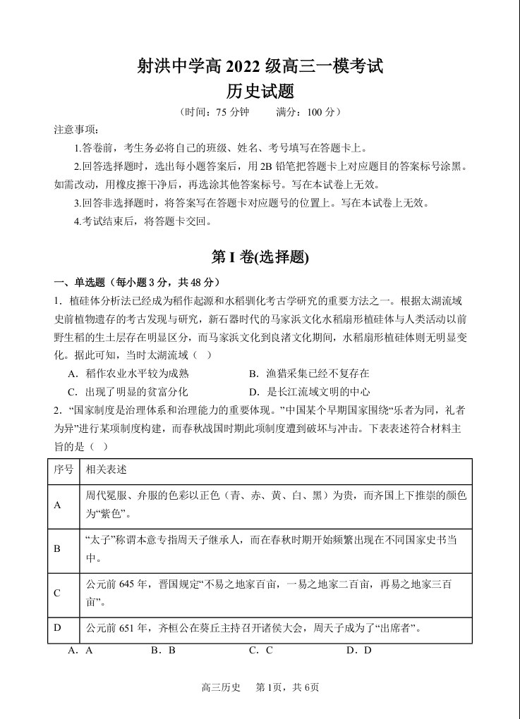 四川省射洪中学高2022级高三一模考试 历史