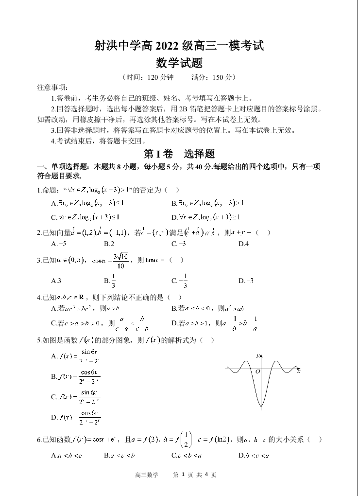 四川省射洪中学高2022级高三一模考试 数学