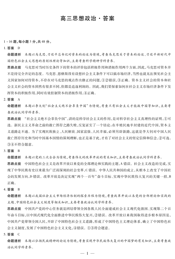 天一大联考2024-2025学年(上)湖南高三一联 政治答案