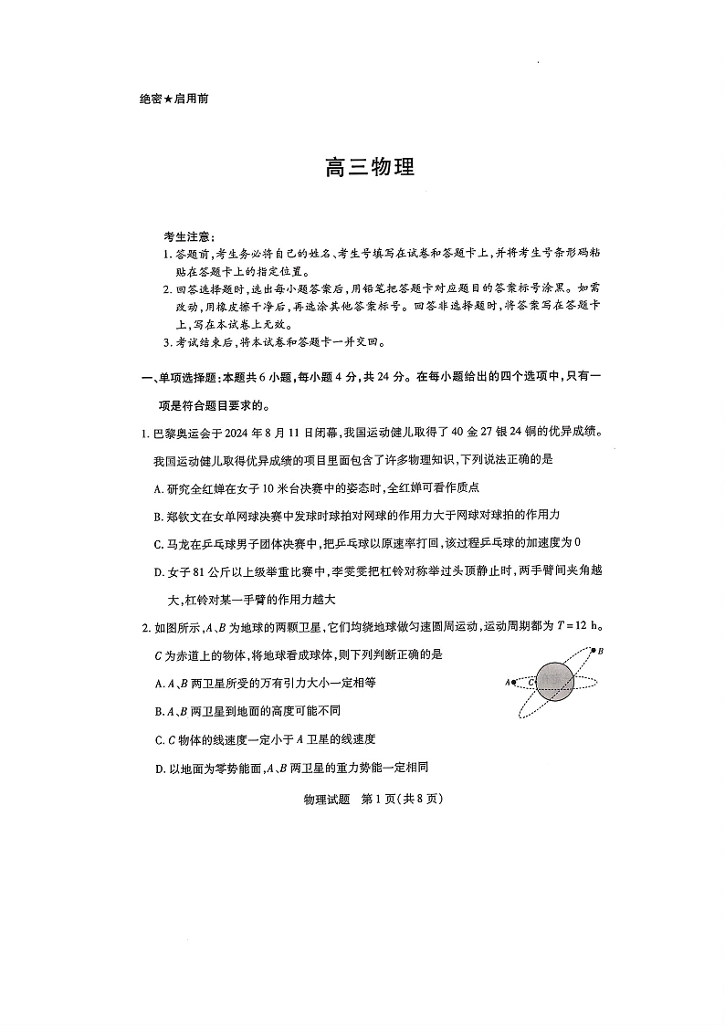 天一大联考2024-2025学年(上)湖南高三一联 物理