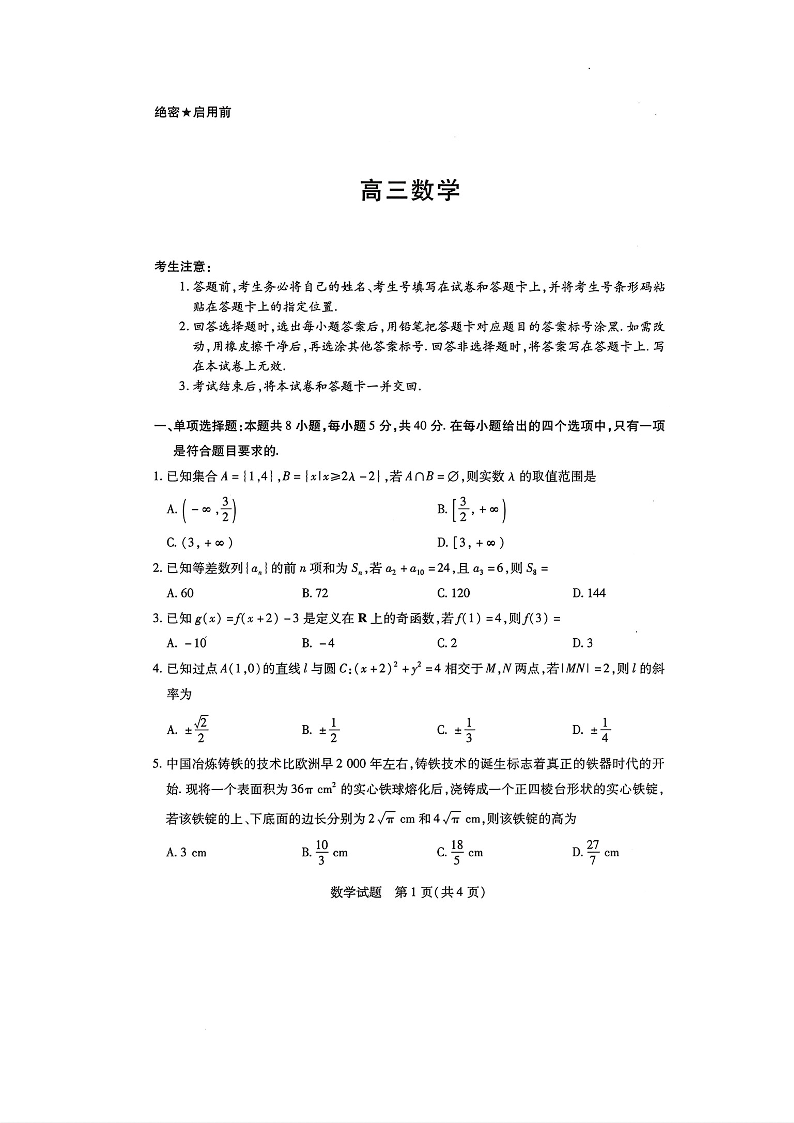 天一大联考2024-2025学年(上)湖南高三一联 数学