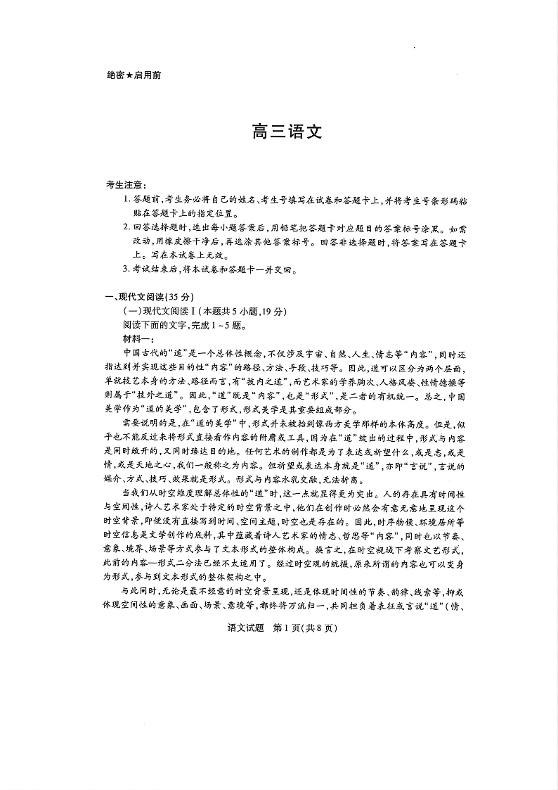 天一大联考2024-2025学年(上)湖南高三一联 语文