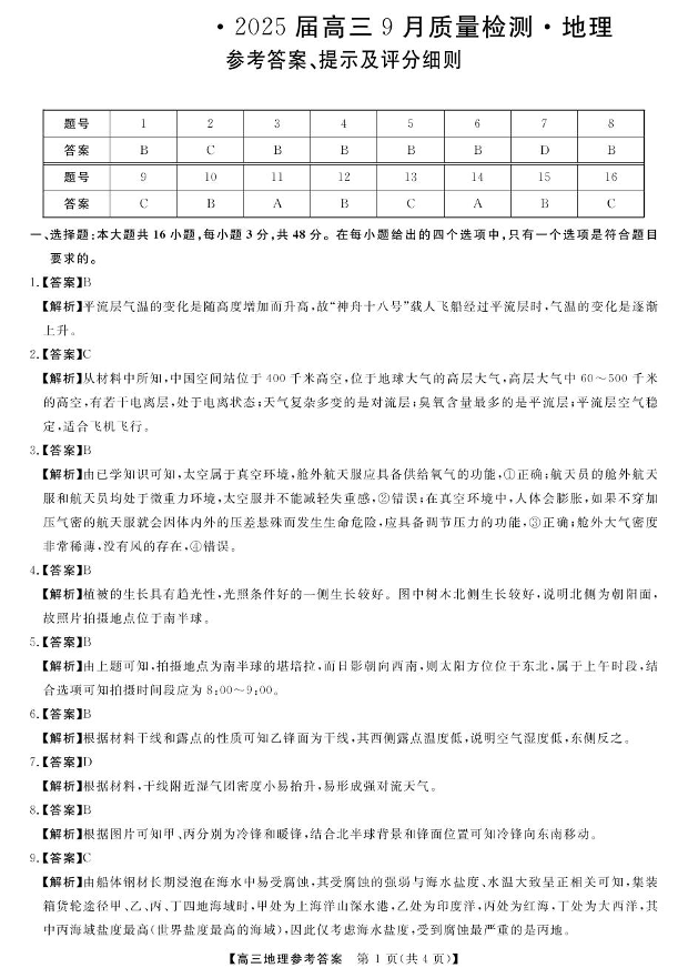 金科大联考·2025届高三9月质量检测 地理答案