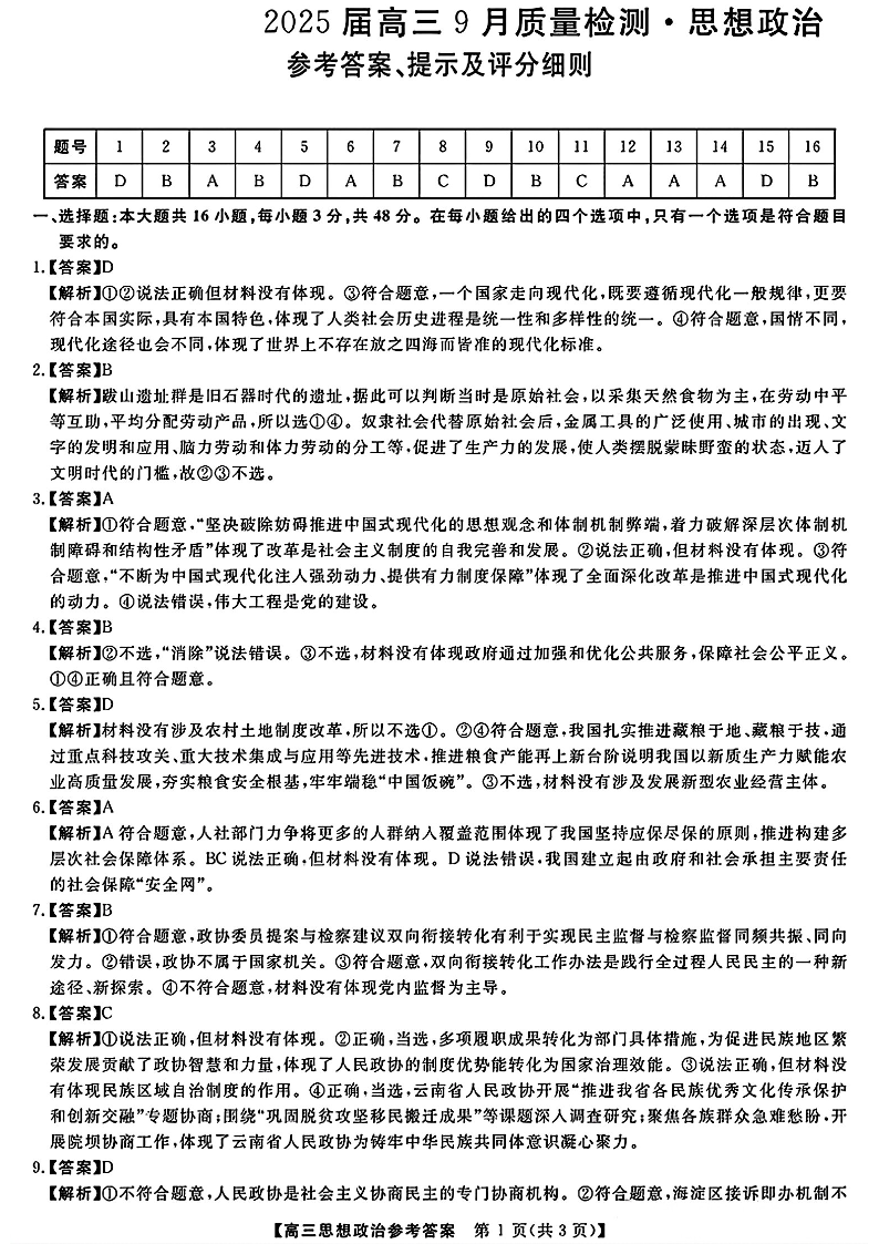 金科大联考·2025届高三9月质量检测 政治答案