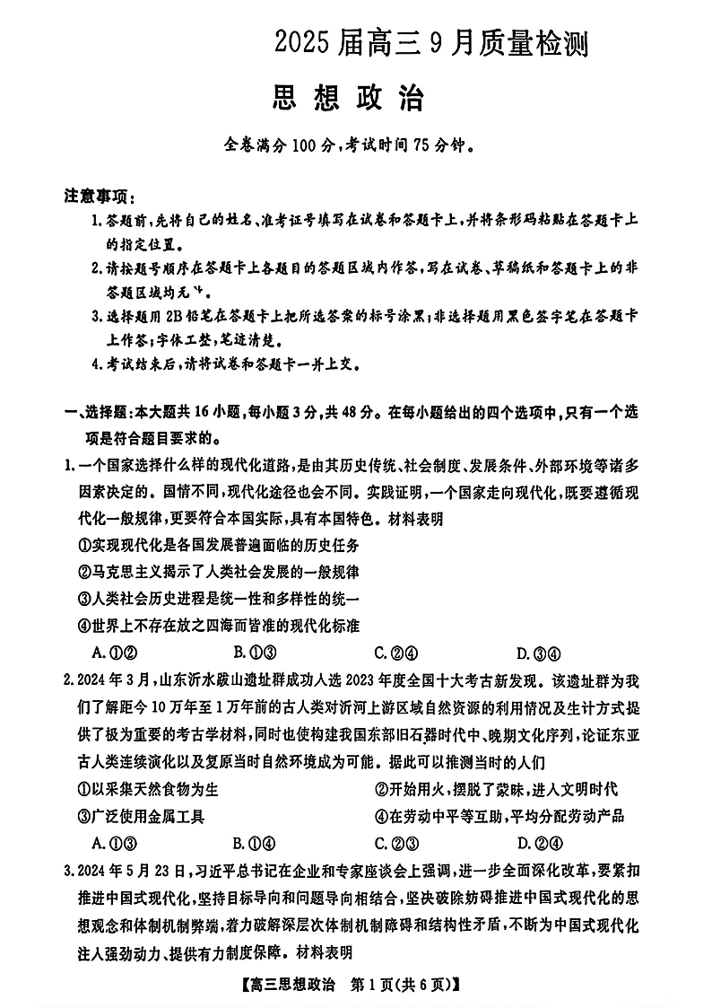 金科大联考·2025届高三9月质量检测 政治