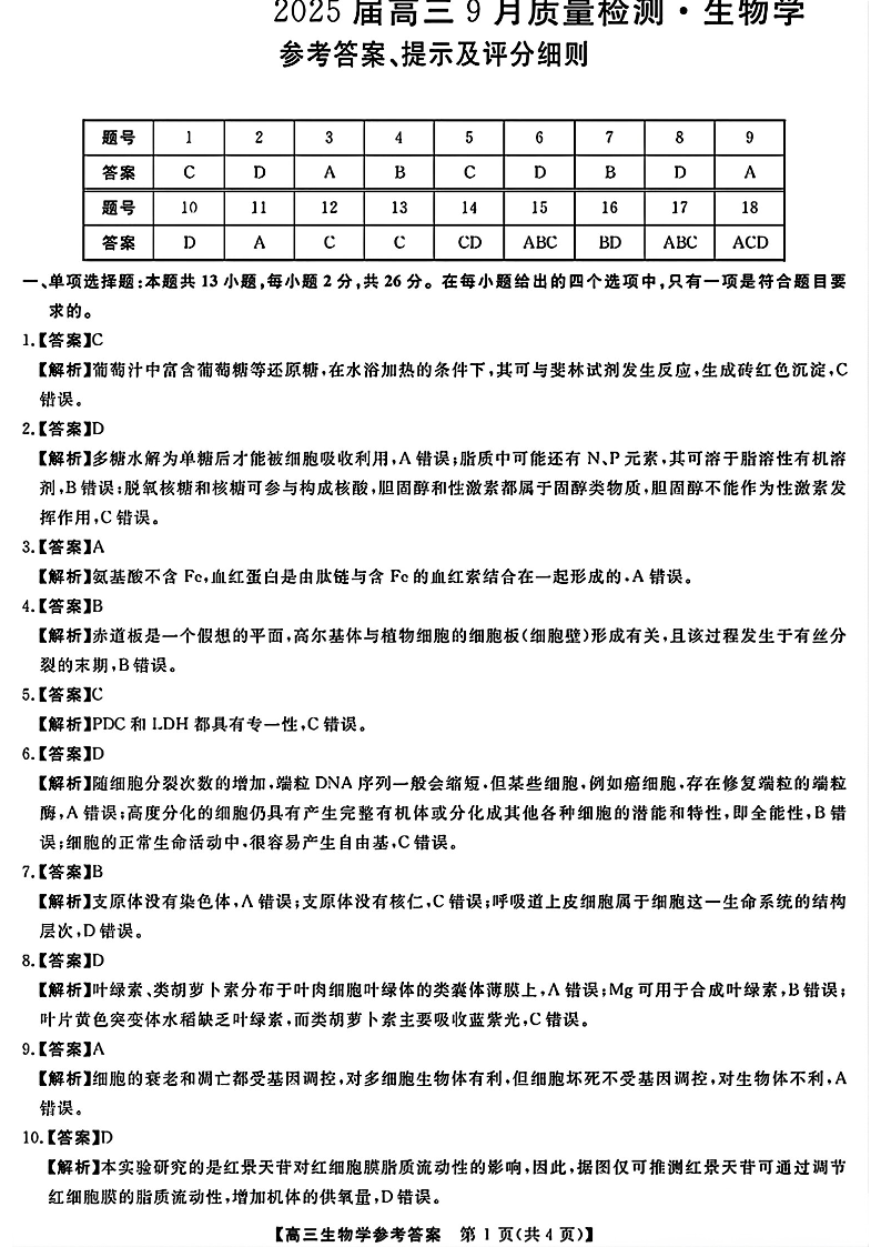 金科大联考·2025届高三9月质量检测 生物答案