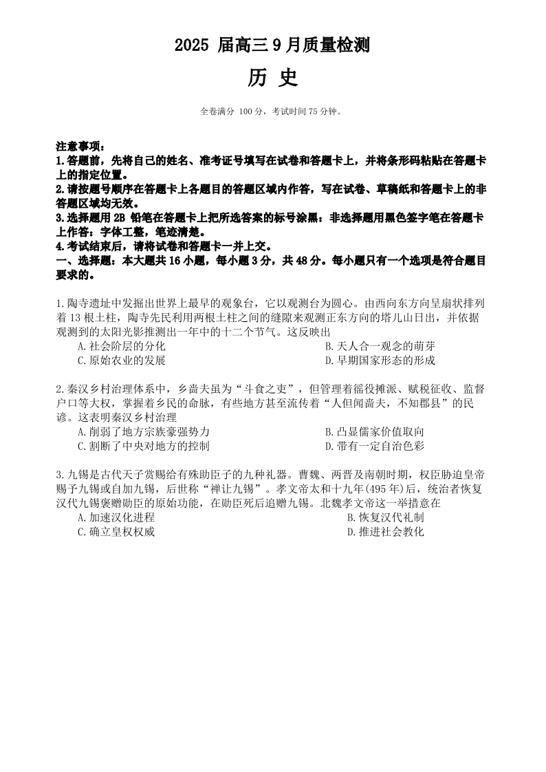 金科大联考·2025届高三9月质量检测 历史