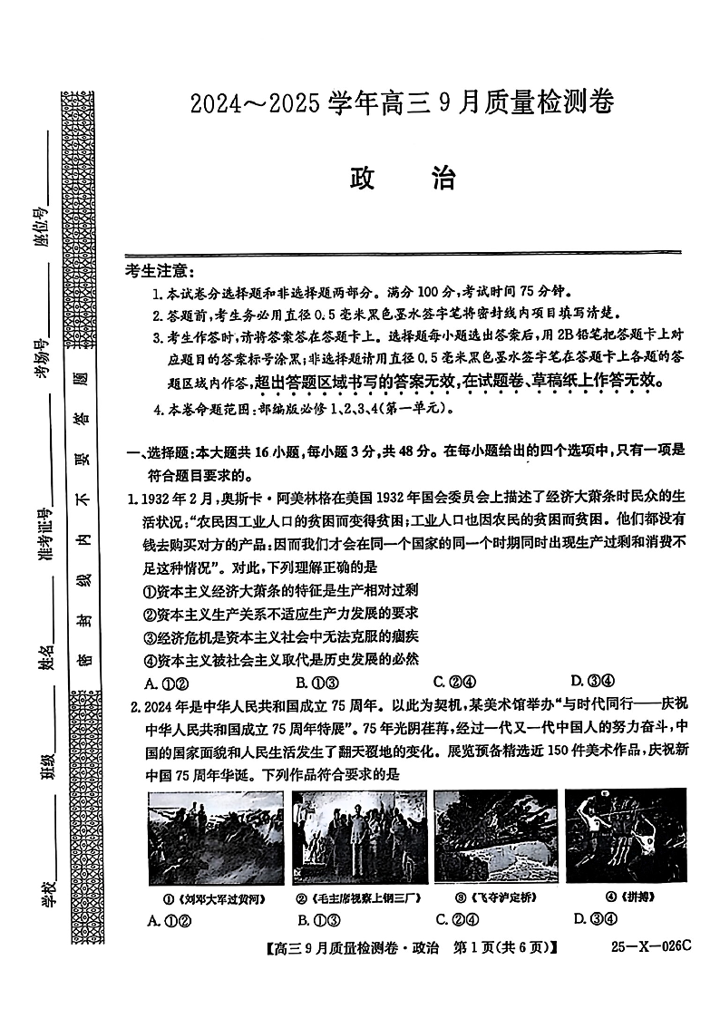 三晋卓越联盟·山西省2024-2025学年度高三9月质量检测 政治