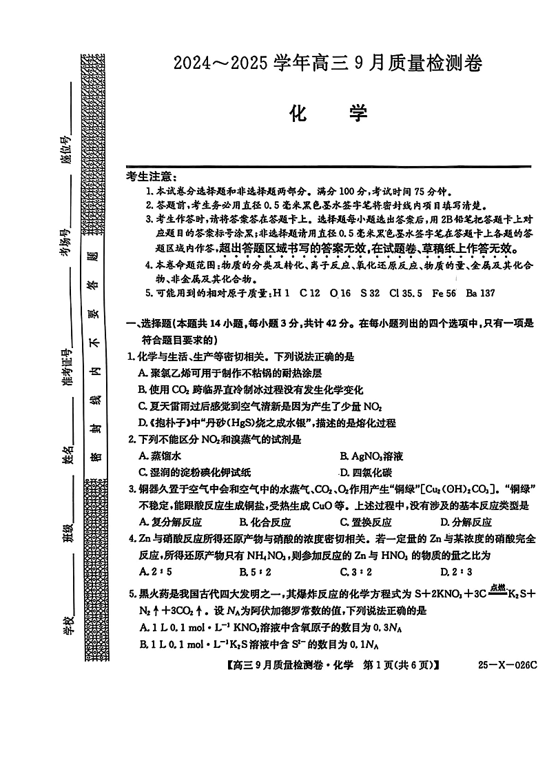 三晋卓越联盟·山西省2024-2025学年度高三9月质量检测 化学