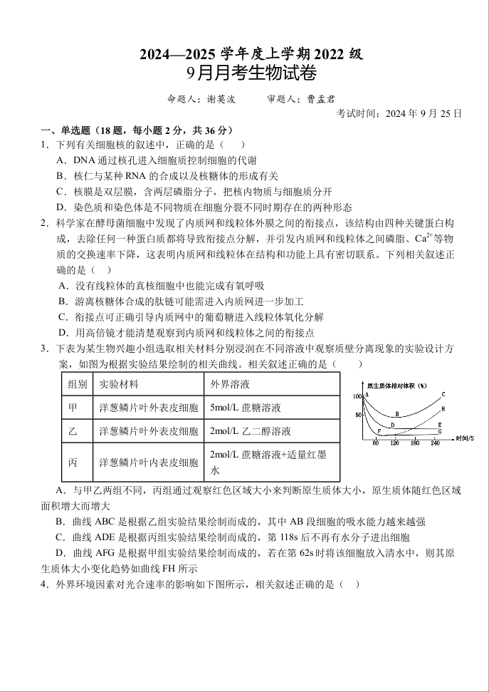 湖北省沙市中学2024-2025学年高三上学期9月月考试题 生物