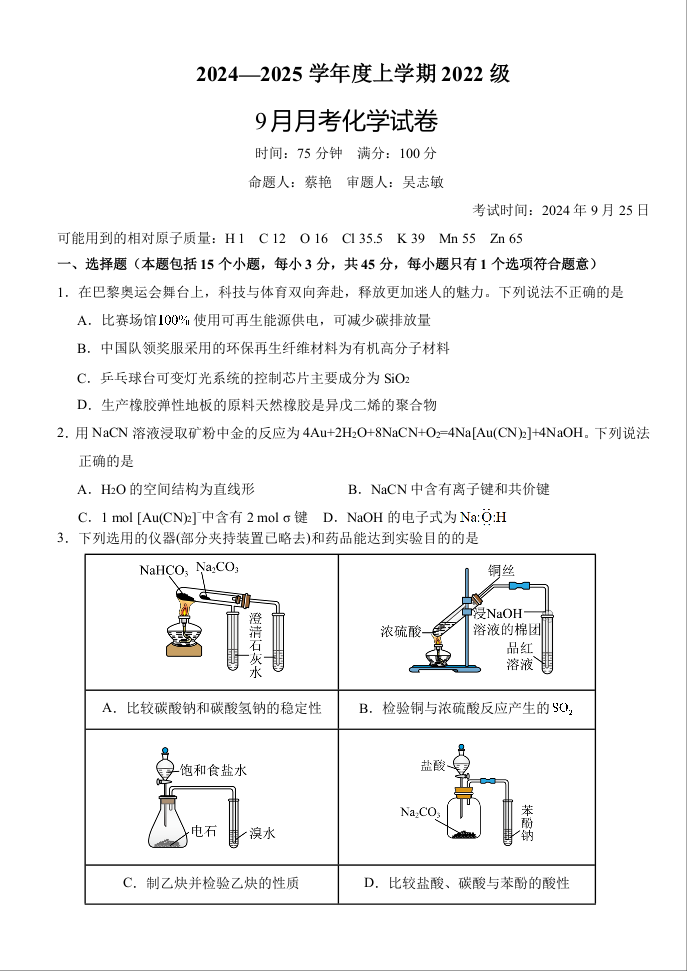 湖北省沙市中学2024-2025学年高三上学期9月月考试题 化学