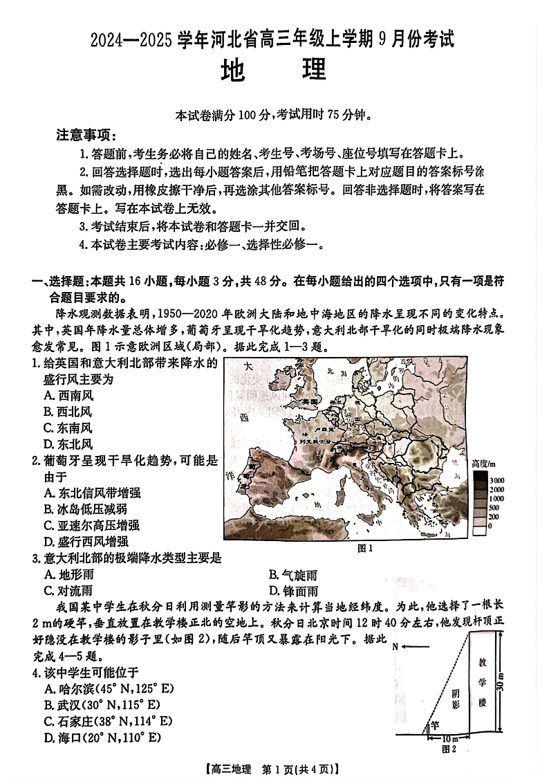 河北省2024-2025学年高三年级上学期9月份考试 地理