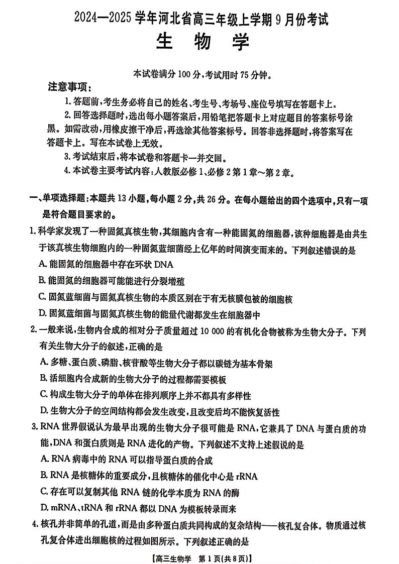河北省2024-2025学年高三年级上学期9月份考试 生物