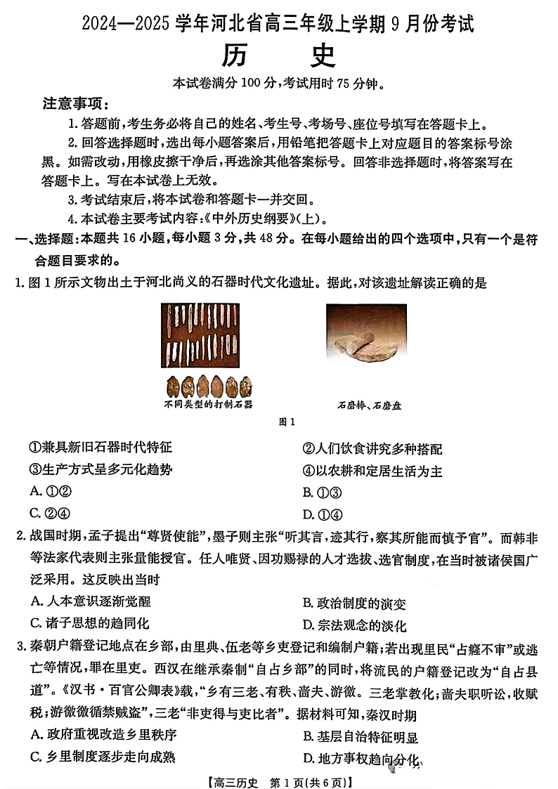 河北省2024-2025学年高三年级上学期9月份考试 历史