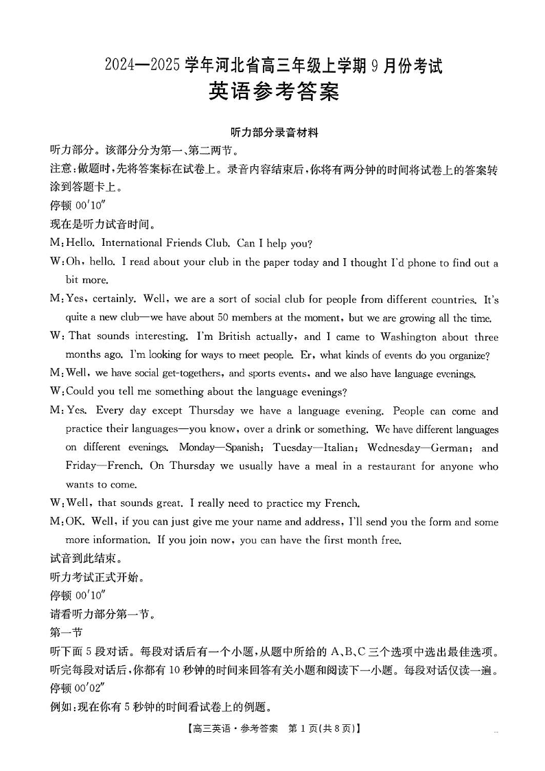 河北省2024-2025学年高三年级上学期9月份考试 英语答案