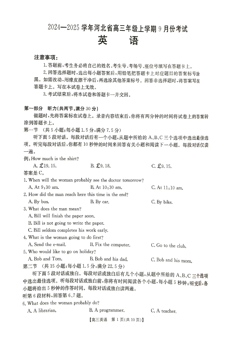 河北省2024-2025学年高三年级上学期9月份考试 英语