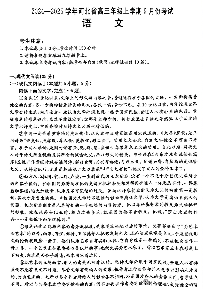河北省2024-2025学年高三年级上学期9月份考试 语文