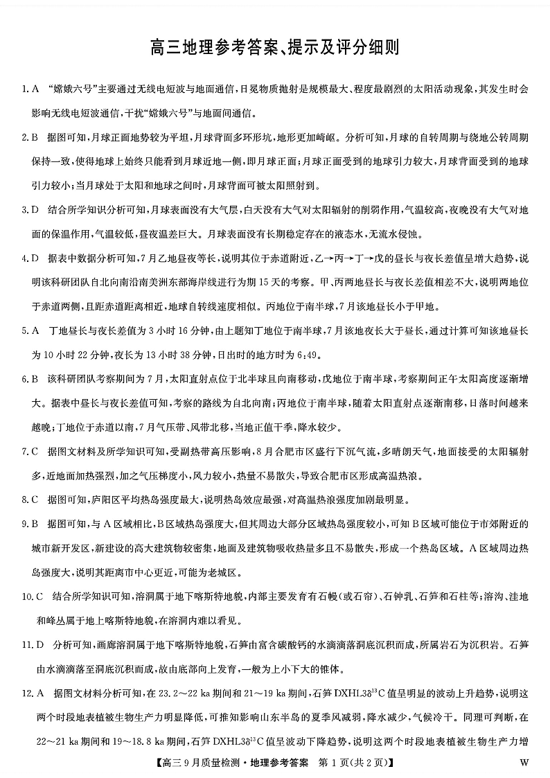 九师联盟2025届高三9月质量检测 地理答案