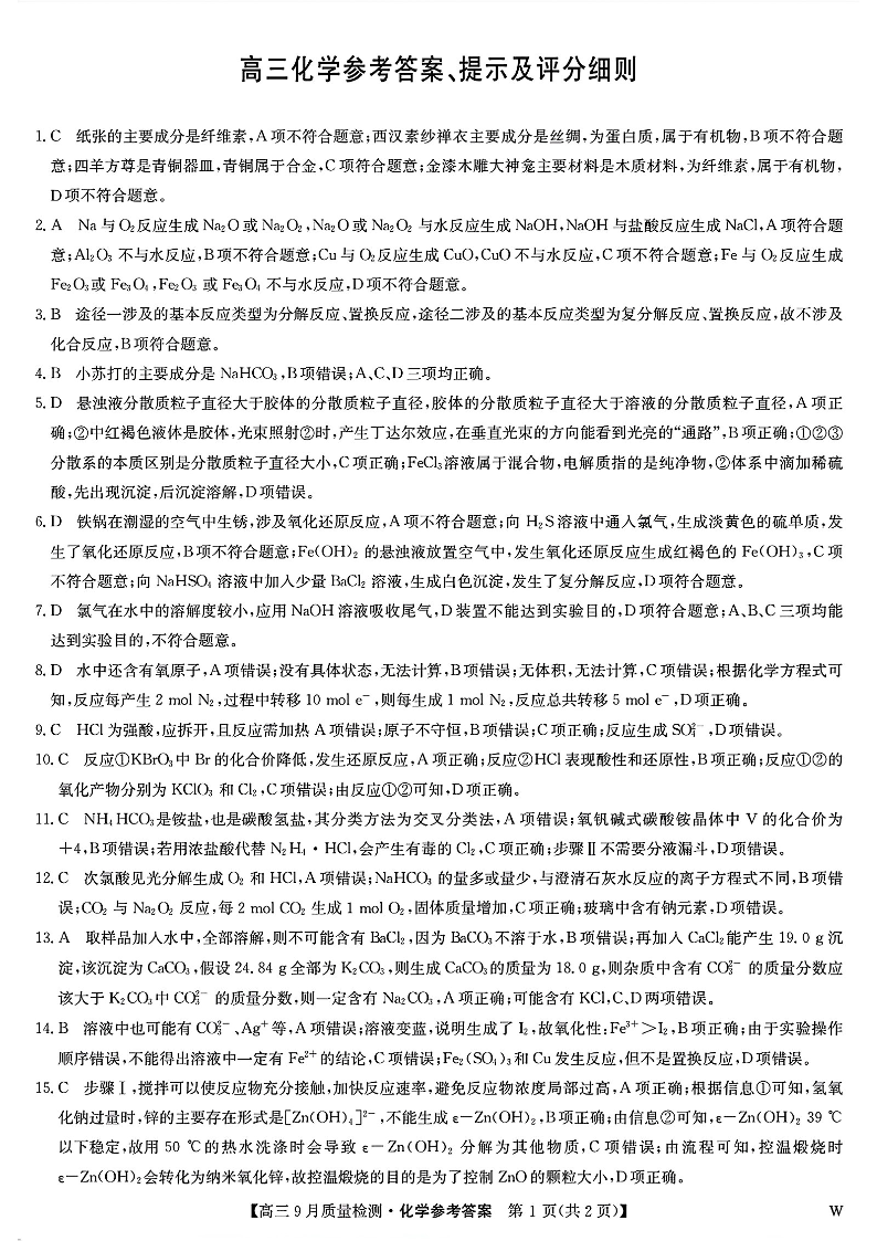 九师联盟2025届高三9月质量检测 化学答案