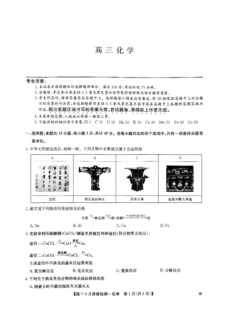 九师联盟2025届高三9月质量检测 化学