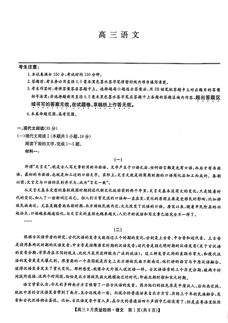 九师联盟2025届高三9月质量检测 语文