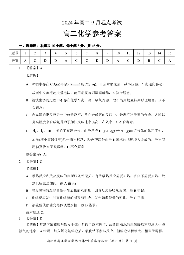 湖北省新高考联考协作体2024年高二9月起点考试 化学答案