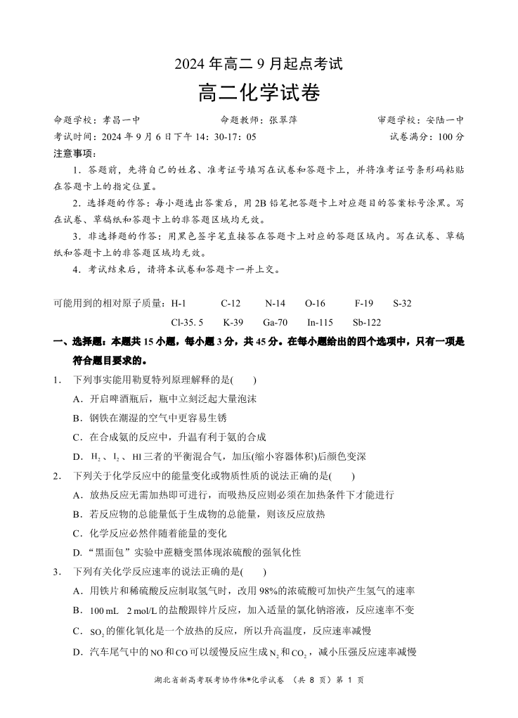 湖北省新高考联考协作体2024年高二9月起点考试 化学