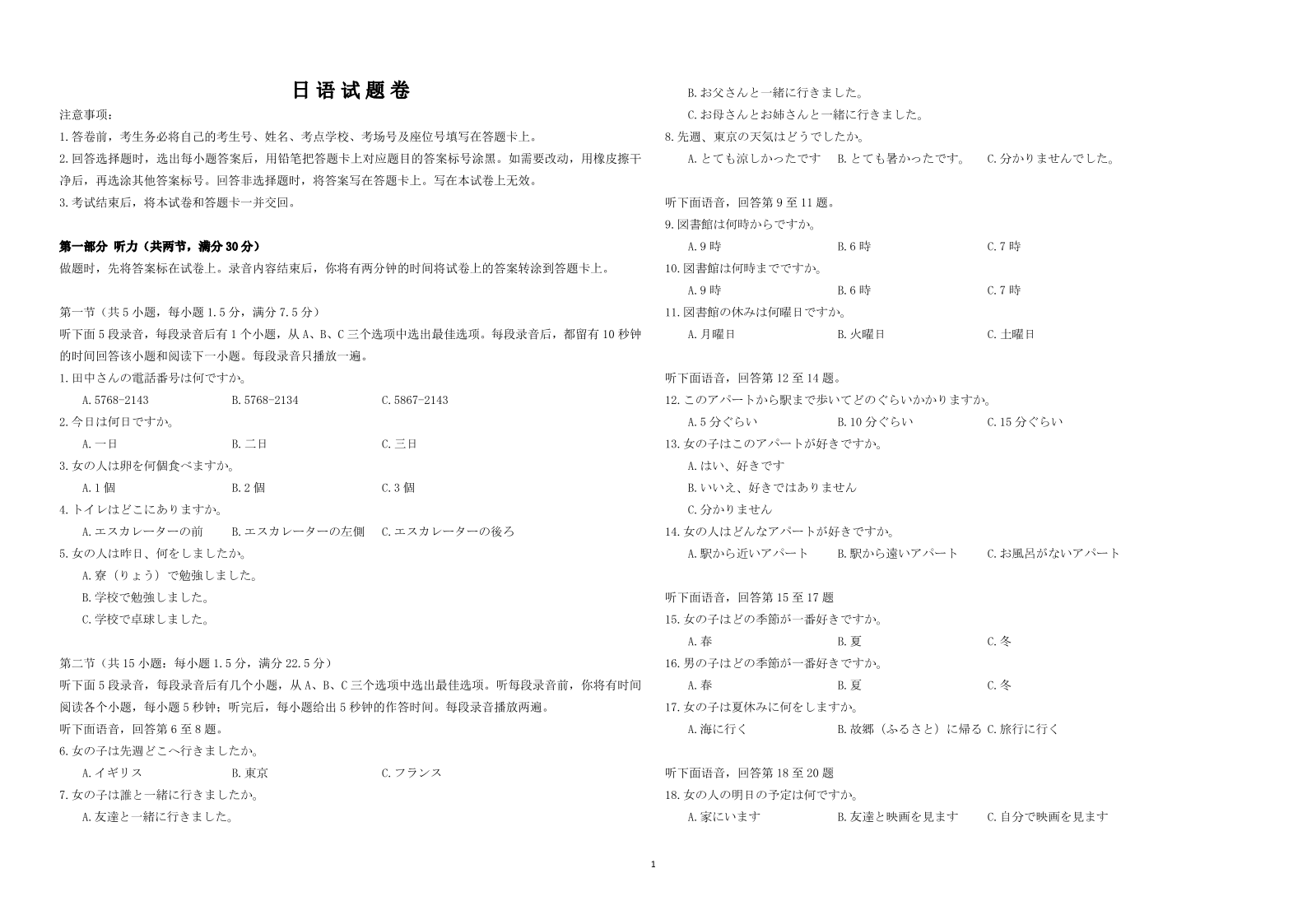 湖北省新高考联考协作体2024年高二9月起点考试 日语