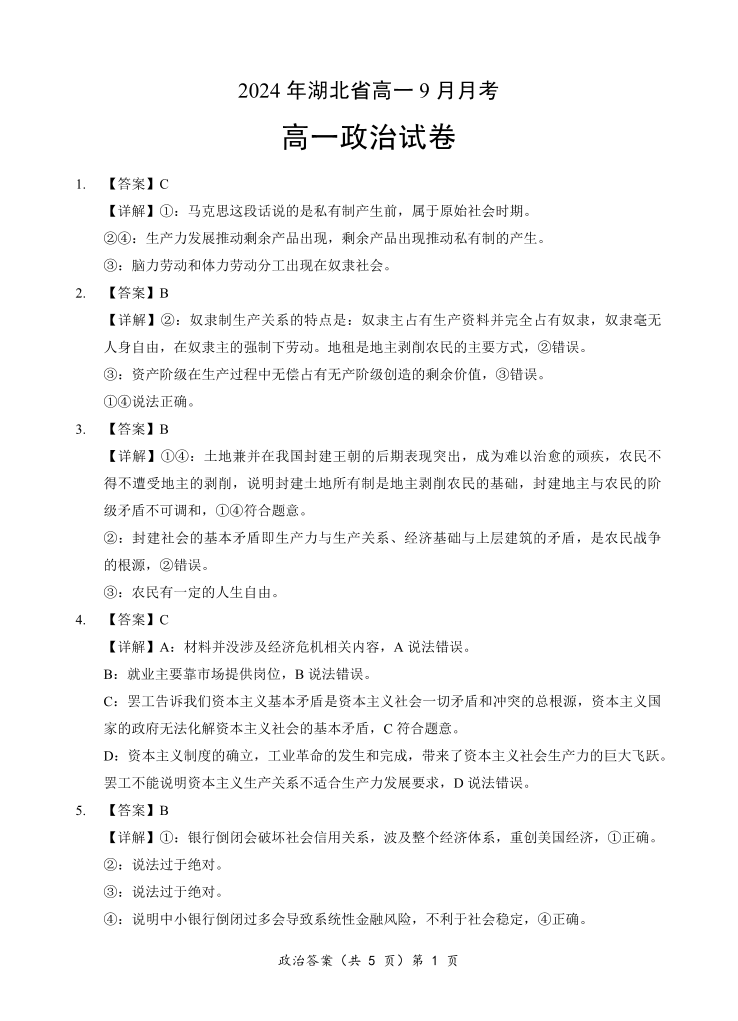 湖北省新高考联考协作体2024 年湖北省高一9月月考 政治答案