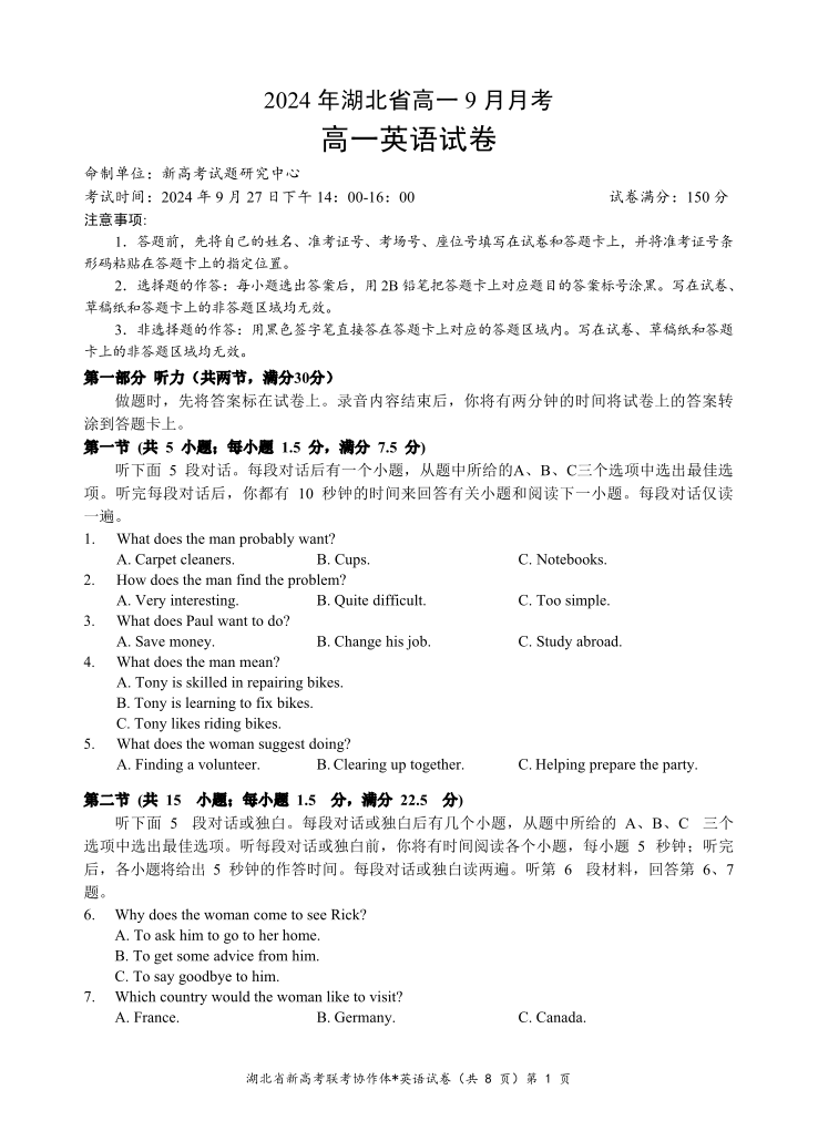湖北省新高考联考协作体2024 年湖北省高一9月月考 英语