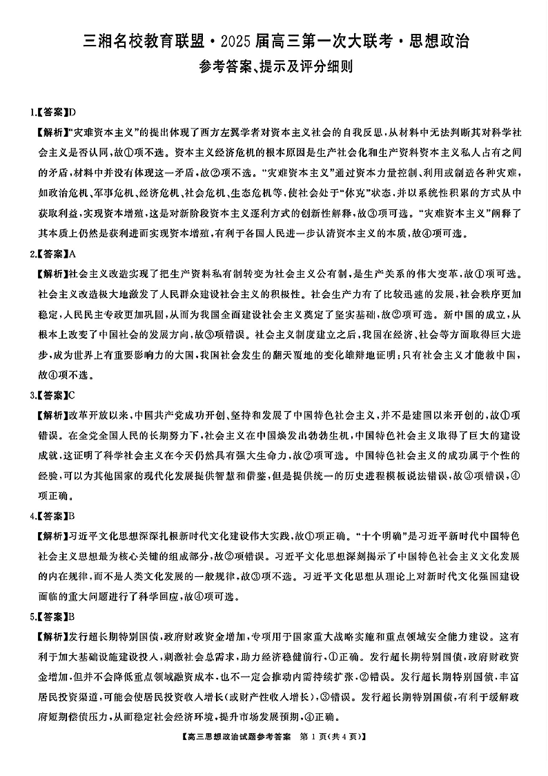 天壹名校联盟&三湘名校教育联盟2025届高三第一次联考 政治答案