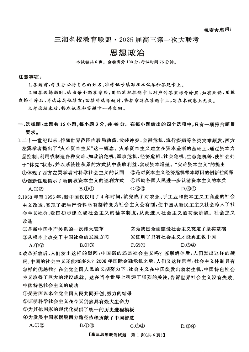 天壹名校联盟&三湘名校教育联盟2025届高三第一次联考 政治