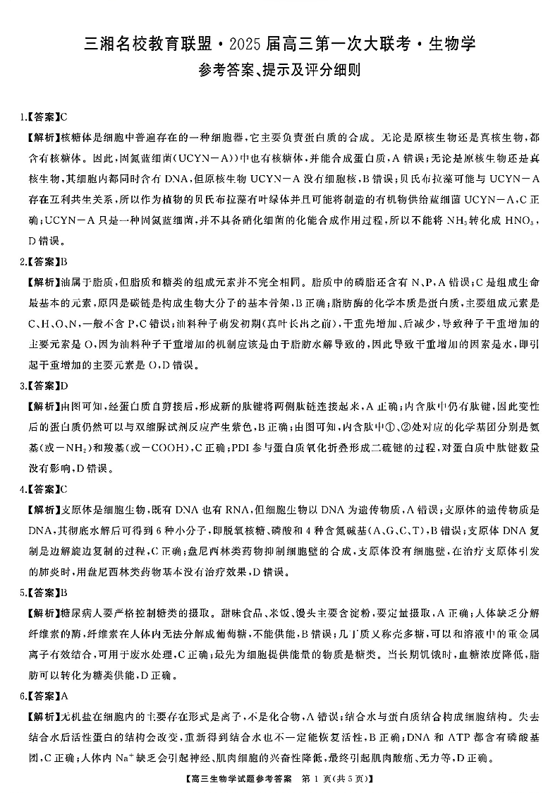 天壹名校联盟&三湘名校教育联盟2025届高三第一次联考 生物答案