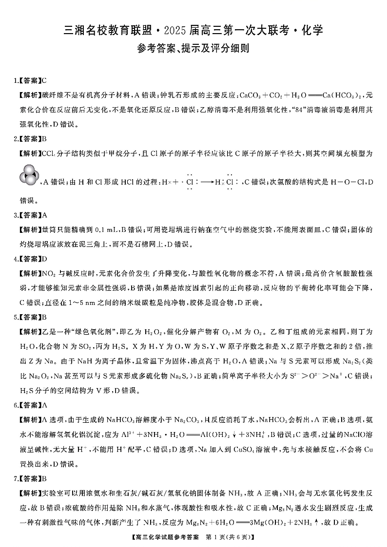 天壹名校联盟&三湘名校教育联盟2025届高三第一次联考 化学答案