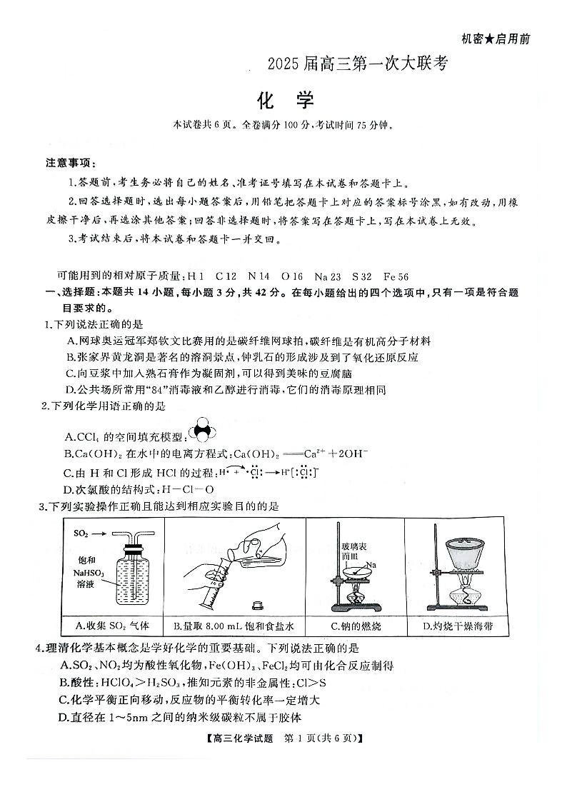 天壹名校联盟&三湘名校教育联盟2025届高三第一次联考 化学