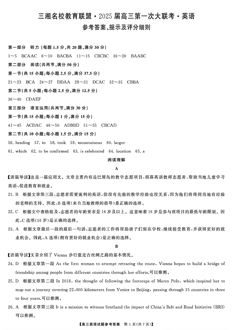 天壹名校联盟&三湘名校教育联盟2025届高三第一次联考 英语答案