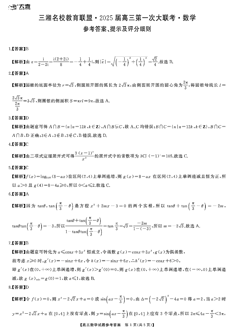 天壹名校联盟&三湘名校教育联盟2025届高三第一次联考 数学答案