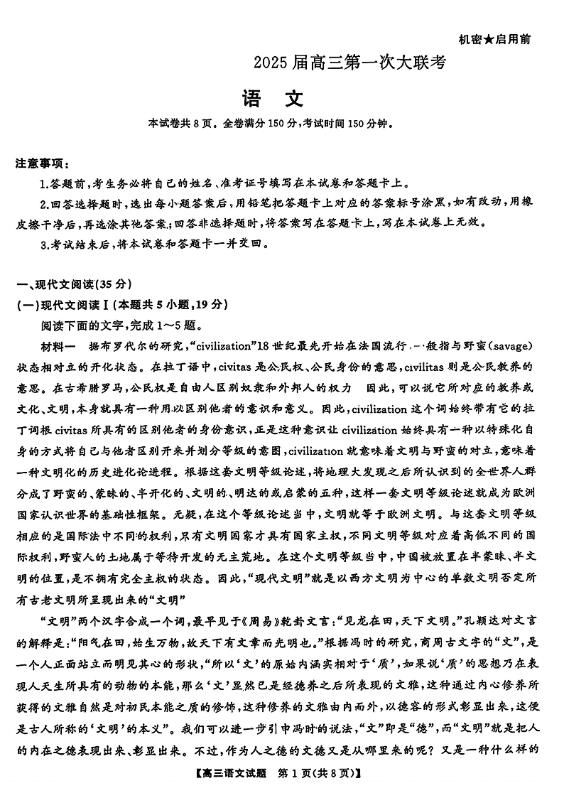 天壹名校联盟&三湘名校教育联盟2025届高三第一次联考 语文
