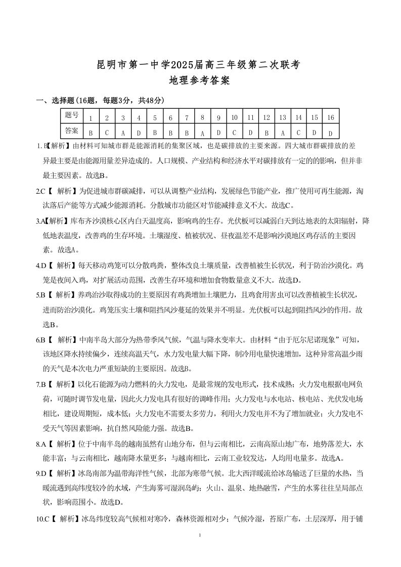 云南省昆明市第一中学2025届高三年级第二次联考 地理答案