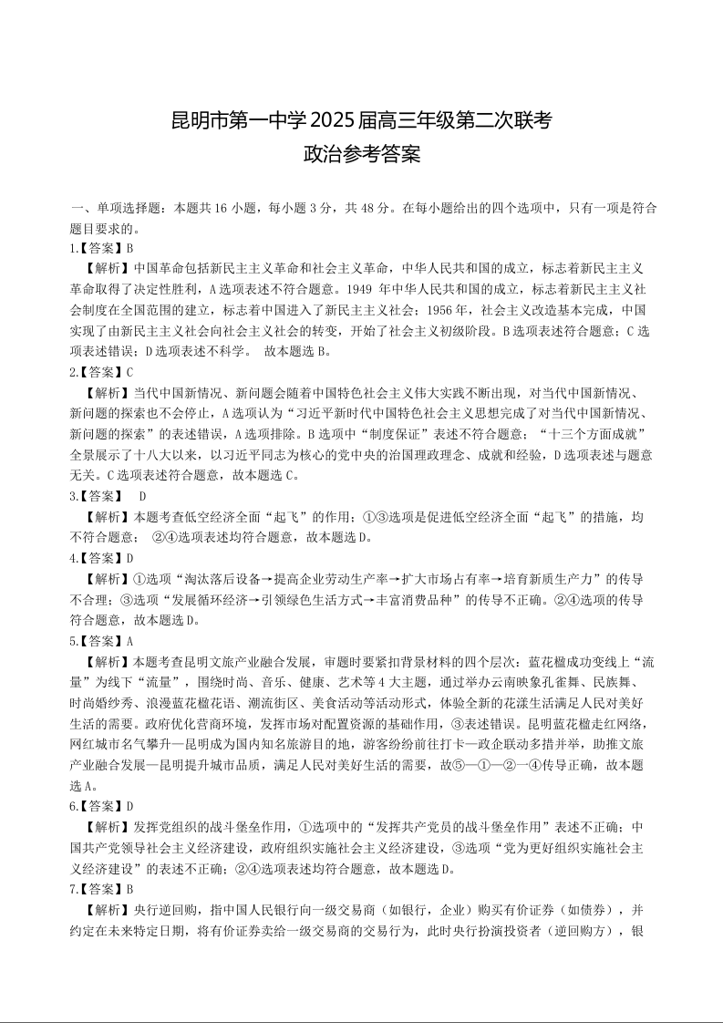 云南省昆明市第一中学2025届高三年级第二次联考 政治答案