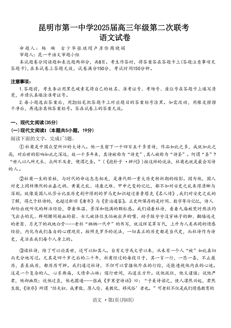 云南省昆明市第一中学2025届高三年级第二次联考 语文
