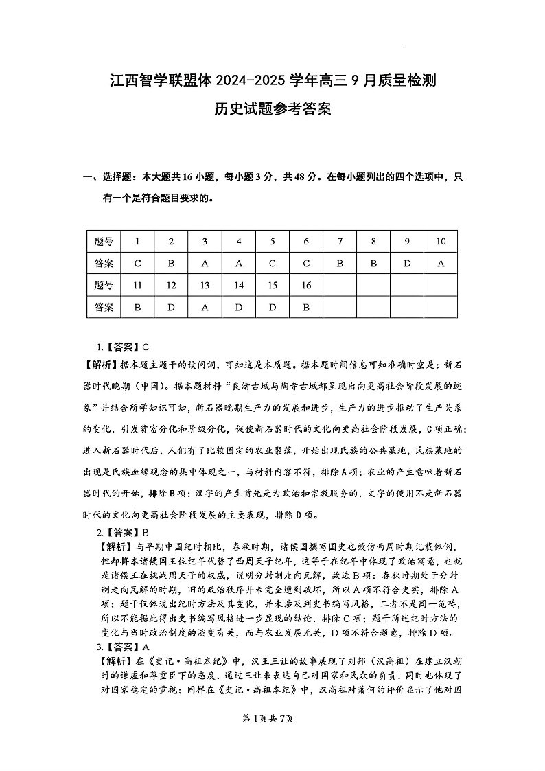 江西智学联盟体2024-2025学年高三9月质量检测 历史答案