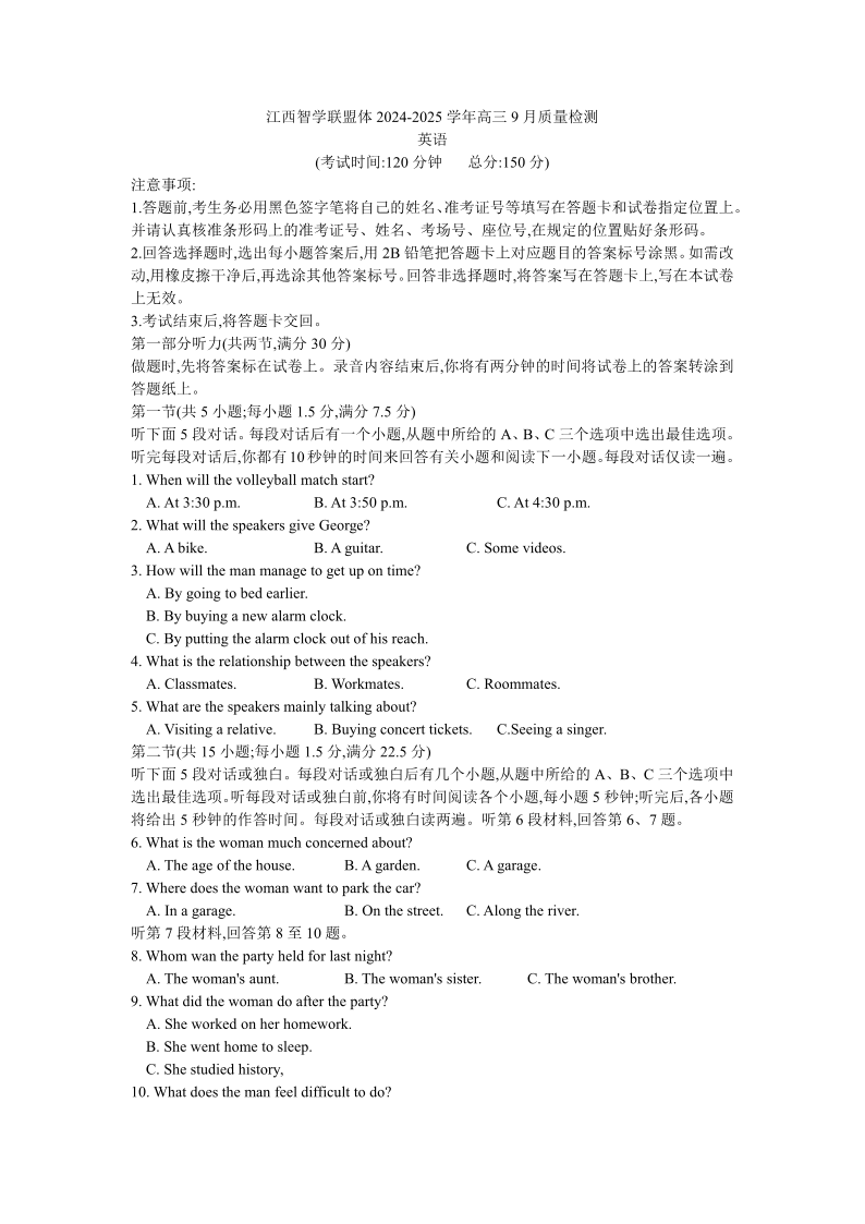 江西智学联盟体2024-2025学年高三9月质量检测 英语