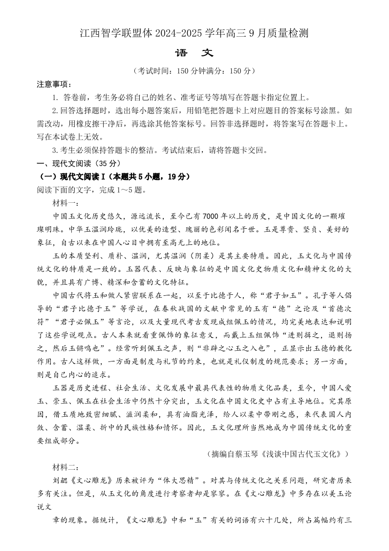 江西智学联盟体2024-2025学年高三9月质量检测 语文