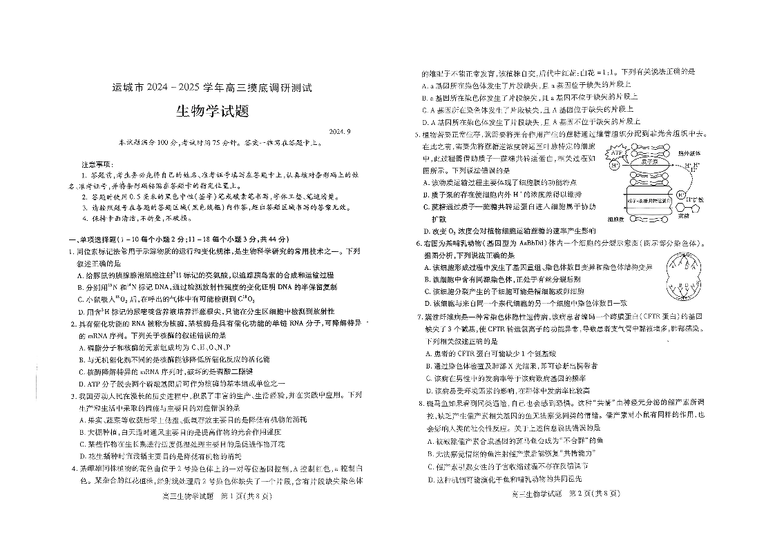 山西省运城市2024-2025学年高三上学期9月摸底调研测试 生物